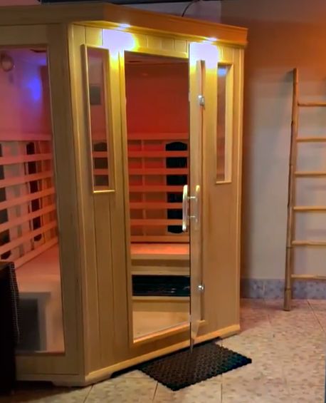 - le sauna est une petite cabine intime en bois : elle peut accueillir quelques personnes, installées sur des banquettes disposées en gradins,